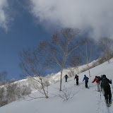 前日降った雪は気温が高いせいもあり腐っていた。その下は重い腐れ雪。新旧腐れ雪の層で滑りにくい。アルペンターンでは厳しく、こういうときこそテレマークターンで抑えながら滑ることが必要なんだなぁとしみじみ実感。ワンステップターンを練習しつつ転倒しつつ滑り降りた。